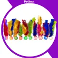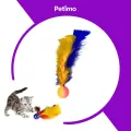 Brinquedo para gatos com penas coloridas e uma bola, atraindo a curiosidade do seu felino e estimulando a caça.